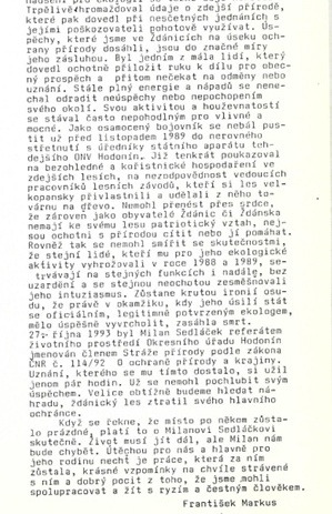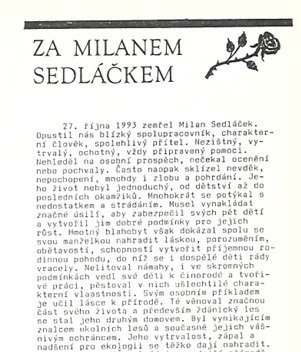 Mezi obětavé a neúnavné ochránce přírody tělem i duší, zvláště v boji za ochranu Ždánického lesa proti necitlivému zásahu těžebních organizací patřil pan Milan Sedláček.